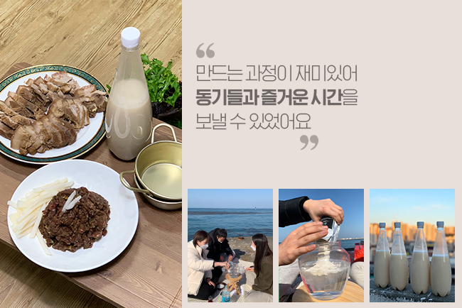 만드는 과정이 생각보다도 간단하고 재미있더라고요. 덕분에 동기들과 화기애애한 시간을 만끽할 수 있었습니다. 코로나로 실내가 아닌 이호테우 바닷가에서 만들었더니 더 특별한 경험이 된 것 같습니다. 막대나 숟가락이 없어 분말을 풀 때 어쩔 수 없이 항아리 채로 흔들었는데 소주병을 흔들던 실력 덕분인지 다행히 터지지는 않았습니다. 만든 다음 날 바로 먹을 수 있다는 점이 매력적이었어요.