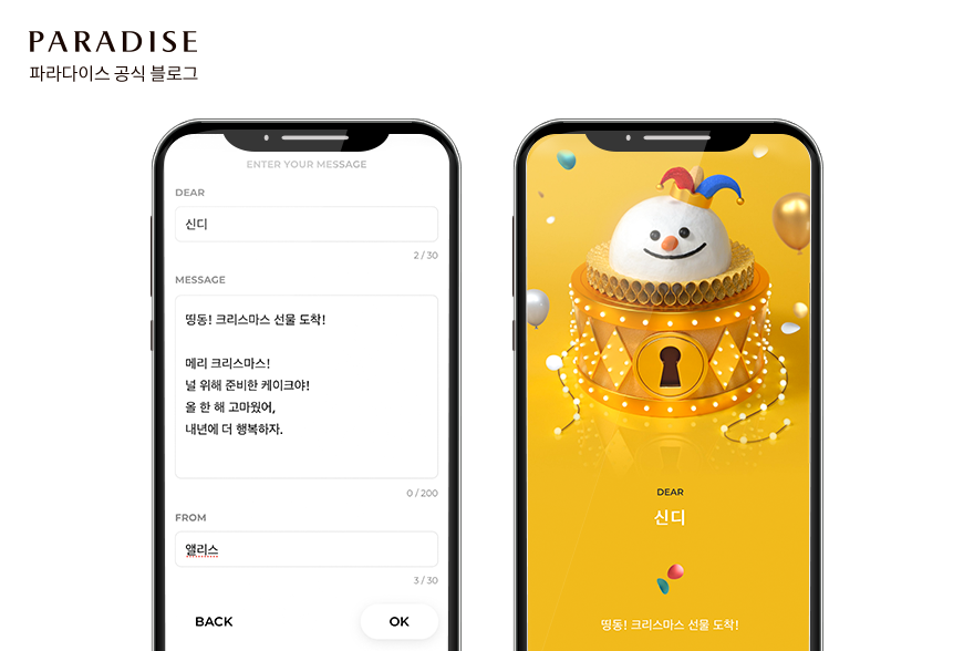 이제 메시지를 입력할 차례입니다. 올해를 마무리하며 전하는 감사 인사도 좋고, 앞으로 다가올 새로운 한 해를 응원하는 마음을 담아도 좋습니다! 카드를 받을 사람과 메시지, 보내는 사람을 차례로 작성한 뒤 OK 버튼을 누르면 나만의 파라다이스 홀리데이 카드 완성!