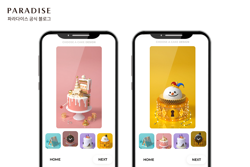 이제 파라다이스 홀리데이 카드를 나만의 스타일로 예쁘게 커스텀할 차례인데요. 핑크, 민트, 퍼플, 옐로우 등 4가지 파스텔 톤 컬러를 테마로 한 케이크들 중 가장 마음에 드는 케이크를 선택한 뒤 우측 하단의 NEXT 버튼을 눌러주세요.