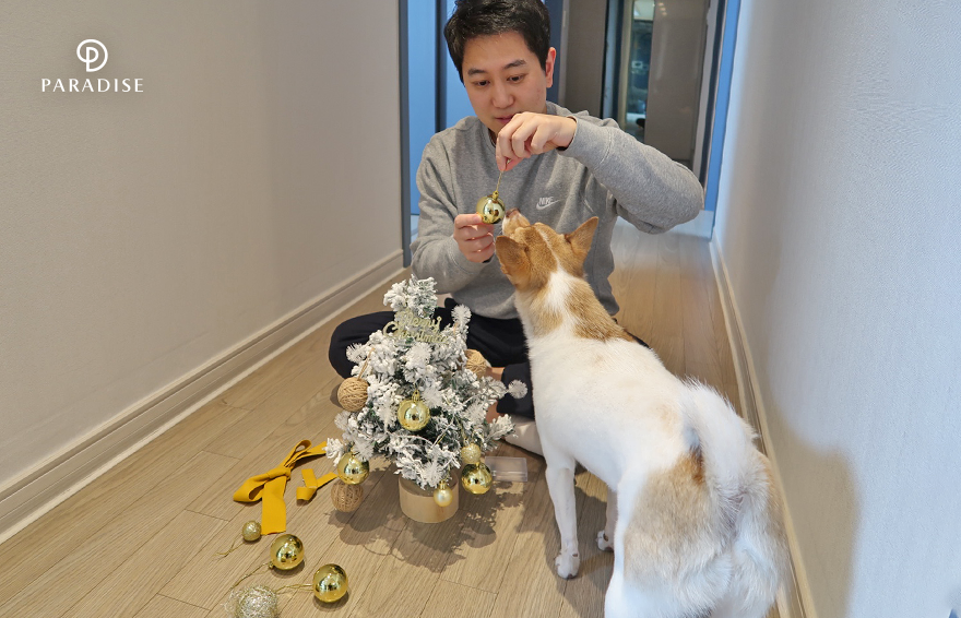혹시, 손재주가 없어서 고민이시라고요? 파라다이스시티 서비스운영파트 김태주 대리도 처음엔 걱정 반 기대 반으로 이번 DIY키트를 신청하게 되었는데요. 걱정과 달리 쉽고 멋진 트리가 완성되어 소중한 크리스마스 추억이 하나 더 늘었답니다. 결혼 5년차인 그는 신혼 때 와이프와 함께 미니 트리를 꾸민 기억도 떠올라 더욱 특별한 감정을 느꼈다고 하는데요. 그때와 달라진 것이 있다면, 새식구인 유기견 올리가 생겼다는 것이죠. 세 가족이 함께한 추억을 하나 더 만들 수 있어서 행복했다며 감사 인사를 전했습니다.