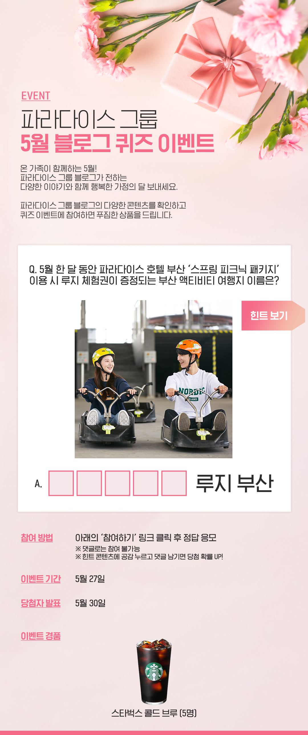 | 파라다이스 그룹 5월 블로그 이벤트 (3회차) & 2회차 당첨자 발표 (57) | 2022.05.25 |