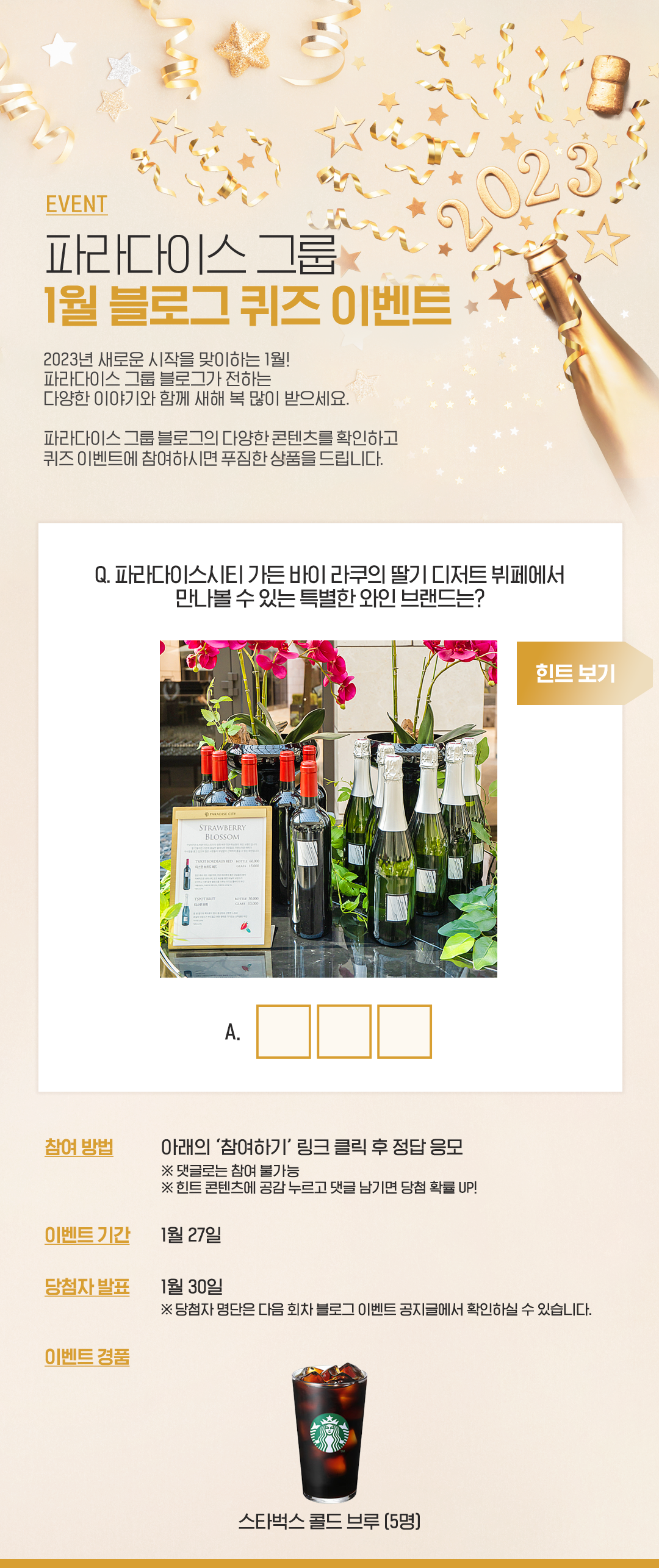 | 파라다이스 그룹 1월 블로그 이벤트 (5회차) & 4회차 당첨자 발표 (36) | 2023.01.31 |