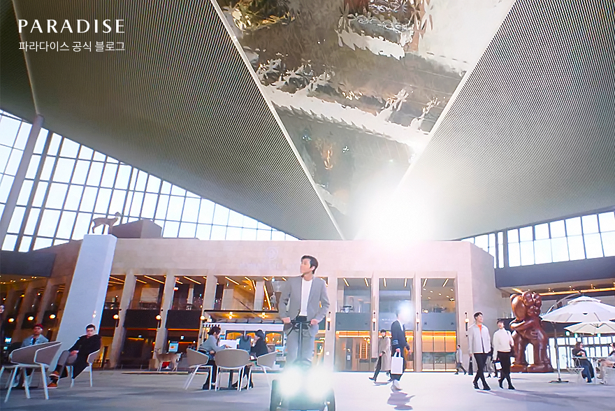 액자 속 파라다이스시티의 세계로 빠져 들어온 박서준 배우가 가장 먼저 도착한 곳은 파라다이스시티의 광장 ‘플라자’입니다. 플라자는 다양한 레스토랑과 카페, 트렌디한 라이프 스타일을 제공하는 편집샵 등이 어우러진 쇼핑 아케이드 공간인데요. 넓은 공간에 다채로운 이벤트와 새로운 엔터테인먼트 공연이 함께하는 파라다이스의 허브에서 박서준 배우와 함께하는 숨바꼭질이 시작됩니다.