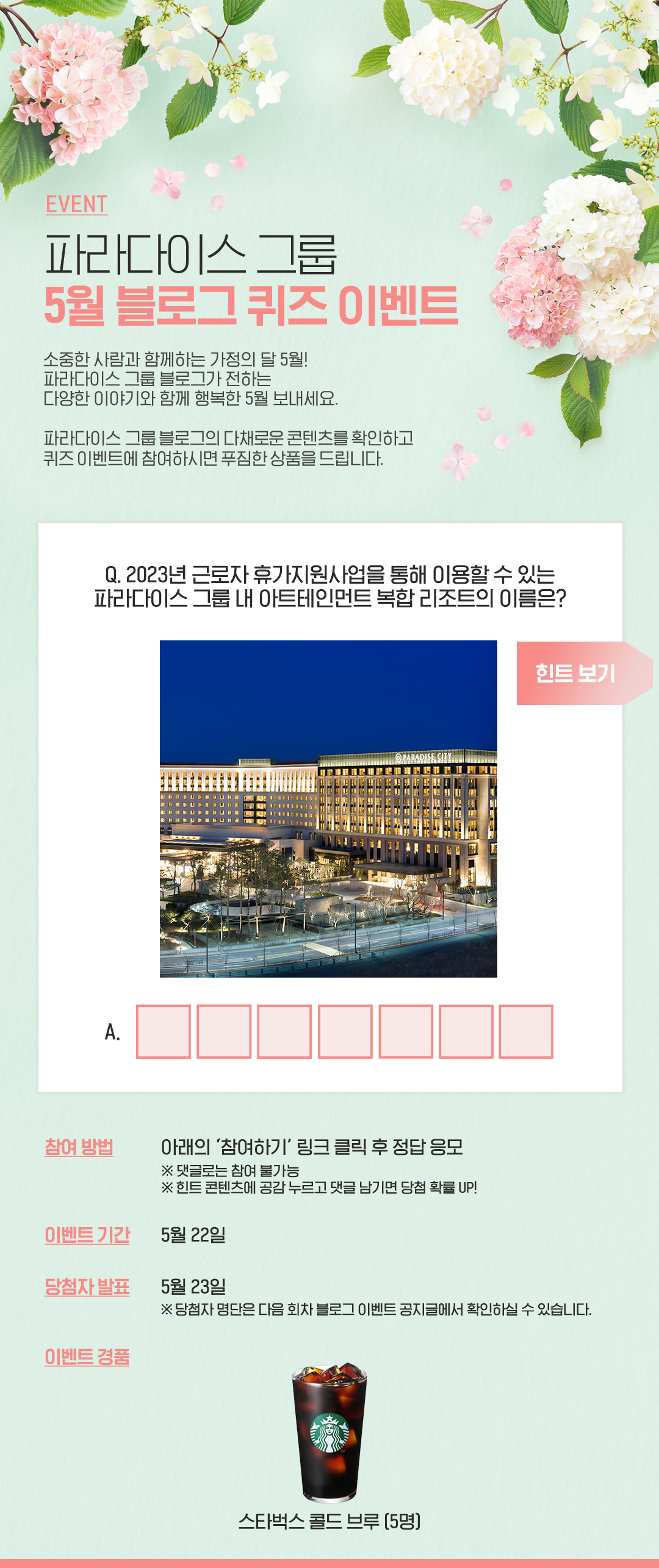 | 파라다이스 그룹 5월 블로그 이벤트 (2회차) & 1회차 당첨자 발표 (50) | 2023.05.23 |