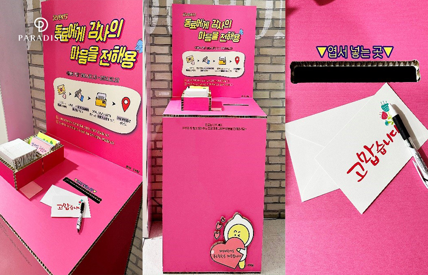 파라다이스시티에서 소중한 동료에게 감사의 마음을 전하는 특별한 사내 이벤트를 진행했습니다. 2월 13일부터 23일까지 지하 1층 구내 식당 앞에 비치된 핑크색 부스에서 동료에게 전하는 칭찬과 감사의 엽서를 보내면, 해당 직원에게 메시지와 함께 소정의 선물이 배달되는 행사였는데요. 파라다이스시티 임직원들은 이번 기회를 통해 평소 고마웠던 동료와 따뜻한 마음을 나누고 팀워크를 다지는 특별한 시간을 가졌습니다. 또한 친환경 재질의 엽서를 사용하여 환경 보호에 힘쓰는 것도 잊지 않았죠. 파라다이스시티는 앞으로도 건강한 조직문화를 위해 임직원들과 다양한 소통을 이어 나갈 예정이니 많은 관심 부탁드립니다.